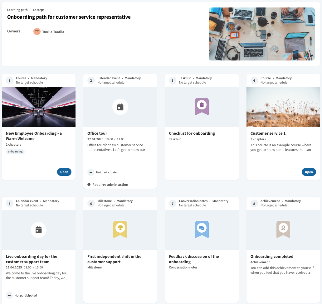 When the onboarding is implemented using Vuolearning, utilize the platform’s learning paths and different activity types: courses, calendar events, achievements, milestones, conversation notes, and task lists. With these, you can build a versatile and motivating onboarding path.