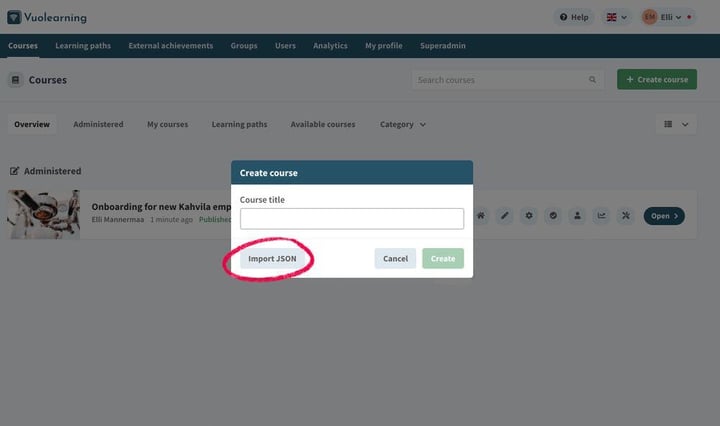 4. After the text parts have been translated, the course can be imported to the platform. This is done by choosing the page Courses and clicking Create course at the top right of the page.