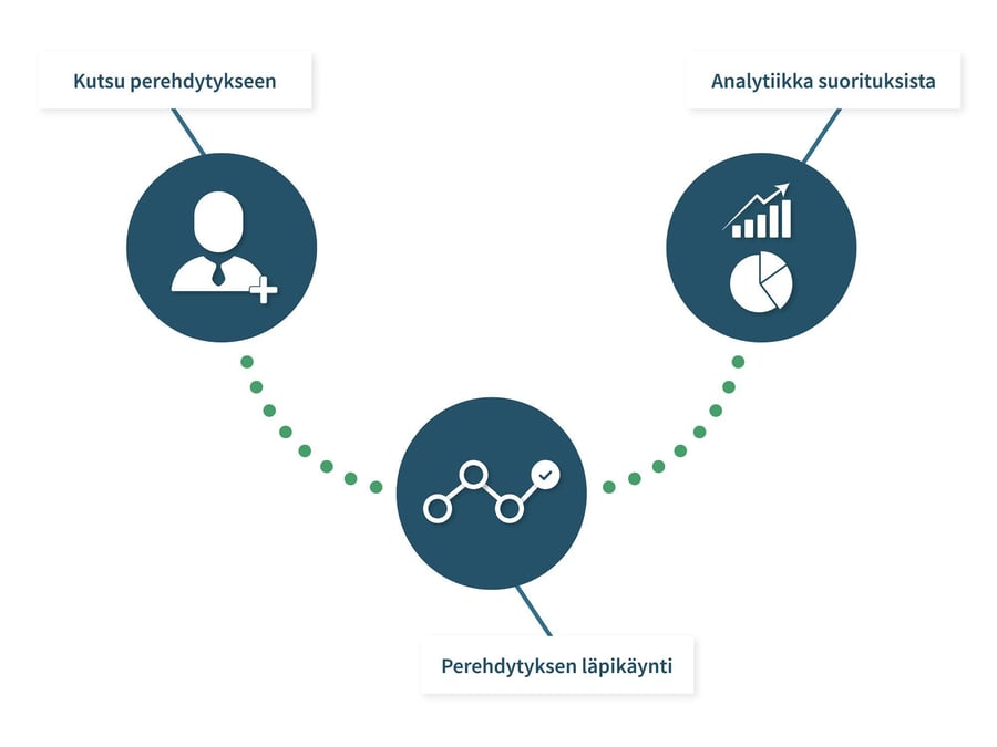 Kun digitaalinen perehdytyskoulutus on julkaistu, on tärkeää opastaa organisaation perehdyttäjiä sen käytössä. Kutsun perehdytysalustalle voi lähettää esimerkiksi sähköpostitse, ja esihenkilö näkee alustalta miten perehdytyskoulutuksissa on edetty ja onko niitä tehty vielä loppuun.