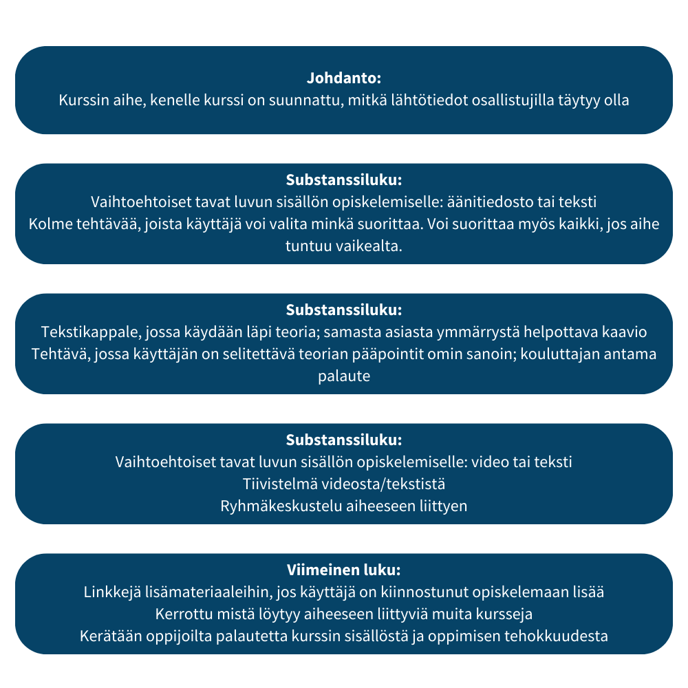 Esimerkki verkkokurssin sisällöstä, joka on toteutettu monipuolisesti erilaiset oppijat huomioiden.