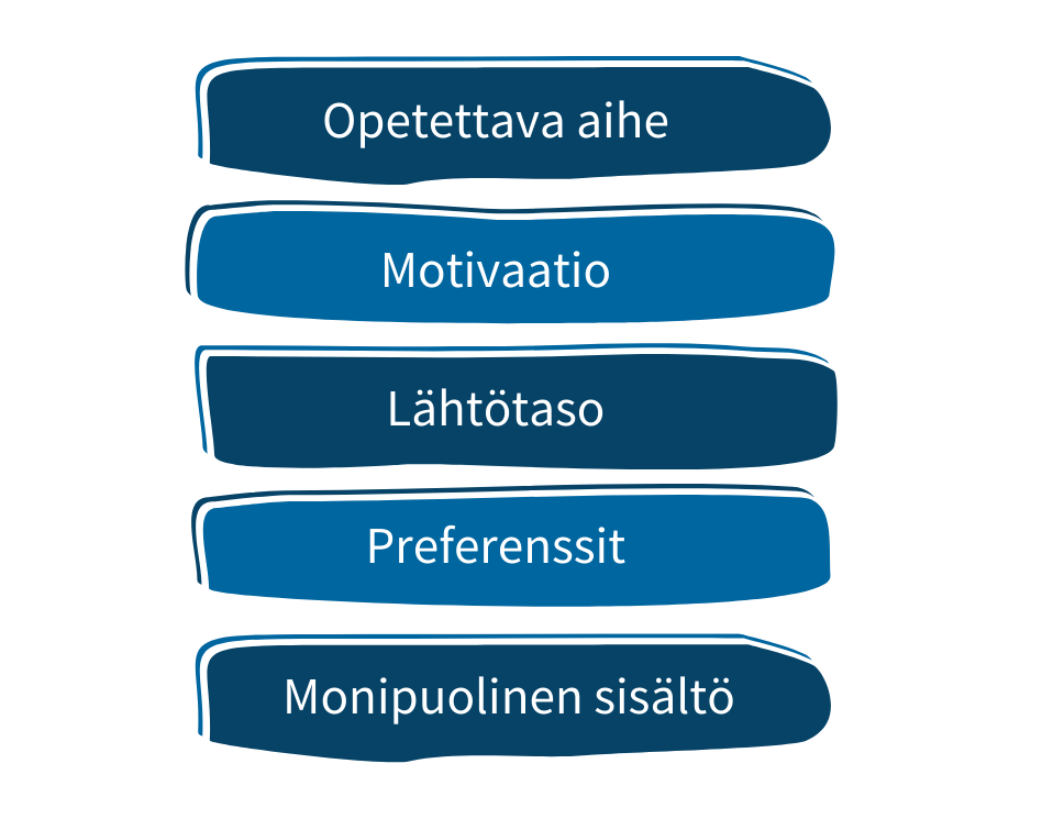 - Oppijoiden preferenssit: Oppijat tykkäävät opiskella eri tavoin, joten vaihtele sisältömuotoja ja tehtävätyyppejä jotta jokaiselle oppijalle on jotakin, tai tarjoa oppimissisältö monessa muodossa, jotta oppija voi valita itselleen parhaiten soveltuvan tavan oppia.