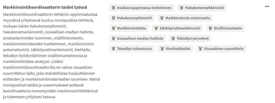 Mitä kyvykkyyksiä tähän tarvitaan: Markkinointikoordinaattorin on hallittava monipuolisesti erilaisia markkinointiin liittyviä taitoja ja osaamisalueita. Hänen tulee tuottaa laadukasta ja kohdennettua sisältöä myös tekoälyä hyödyntämällä, luoda visuaalisesti näyttävää materiaalia, optimoida verkkosivustoa hakukoneita varten, hallita ja tuottaa sisältöä niin orgaanisessa kuin maksullisessa sosiaalisessa mediassa, kyky luoda vaikuttavia asiakastarinoita ja viestiä tehokkaasti oppimisalustan käyttäjille, taito analysoida kampanjoiden tuloksia ja seurata hakukoneoptimoinnin tehokkuutta, kyky hallita erilaisia markkinointityökaluja ja teknologioita oppimisalustan markkinoinnin tukena, erilaisten markkinointiprojektien hallinta samanaikaisesti, kyky työskennellä niin tiimissä kuin itsenäisesti sekä ylläpitää vahvaa kielitaitoa, jotta markkinointia voidaan tehdä usealla kielellä.