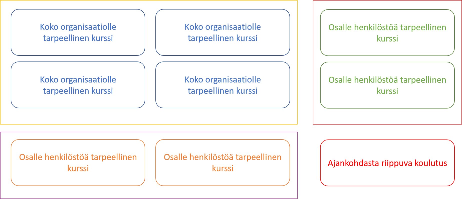Usein käytäntönä on, että organisaation verkkokoulutuspoolissa tietyt koulutukset on automaattisesti tarkoitettu koko henkilöstölle ja osa koulutuksista on suunnattu vain tietylle henkilöstöryhmälle. Lisäksi osa koulutuksista voi olla tarjolla kausiluontoisesti
