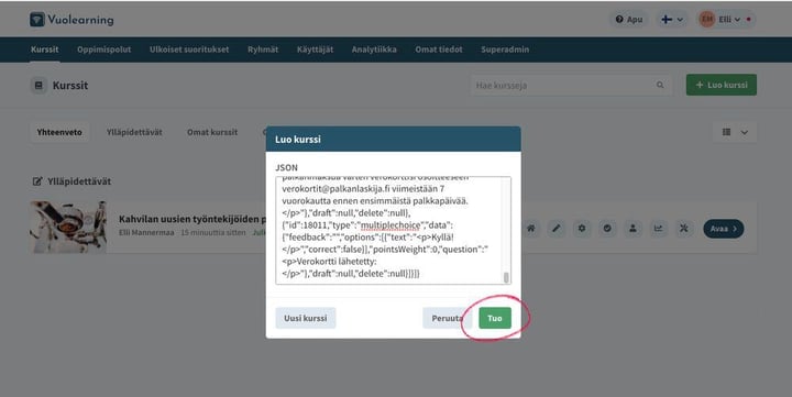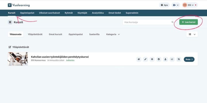 4. Kun tiedoston tekstiosiot on käännetty, kurssi voidaan tuoda oppimisalustalle. Tämä tapahtuu Kurssit-sivulta, klikkaamalla oikean ylänurkan painiketta Luo kurssi.